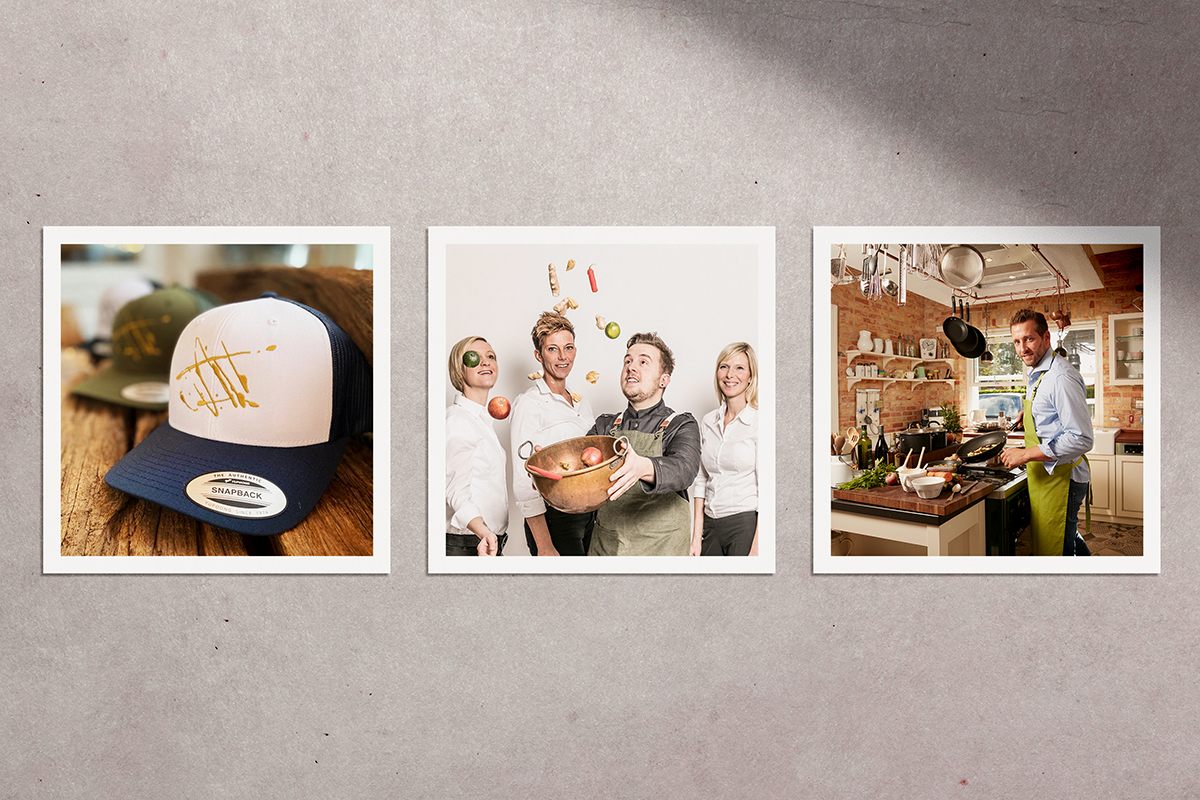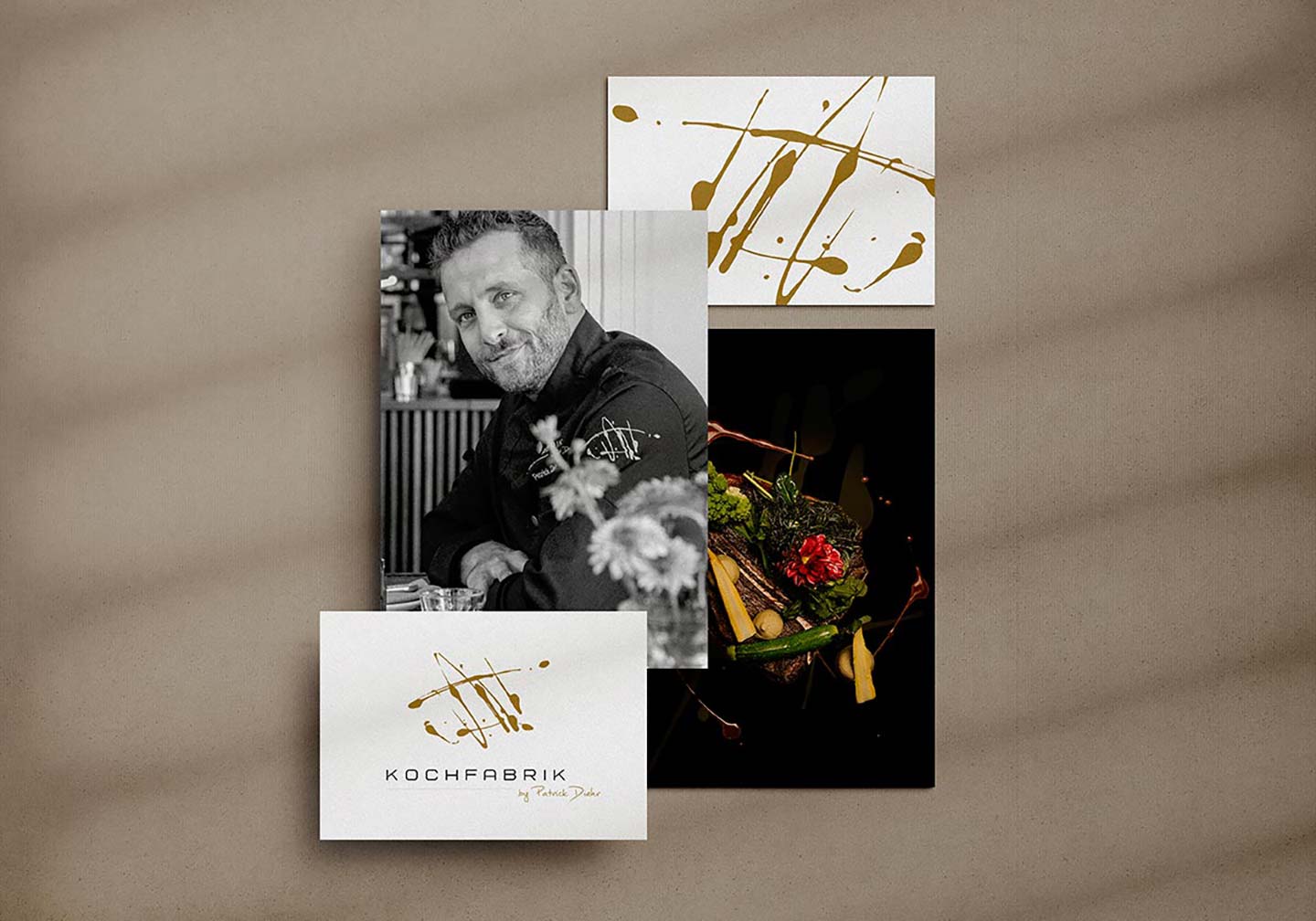 I strived to design a logo that visualises Patrick’s passion for his profession, his expertise and virtuosity as a cook. At some point, during my lunch break, I held a bottle of balsamico in my hands and, only seconds later, found myself drawing with it on plates. The result is a symbol that perfectly matches the initial brief.